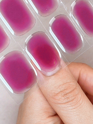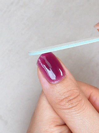 Peel off the backing and carefully place the gel strip on your nail, starting from the cuticle line. Smooth it toward the tip and press down firmly to secure it.
