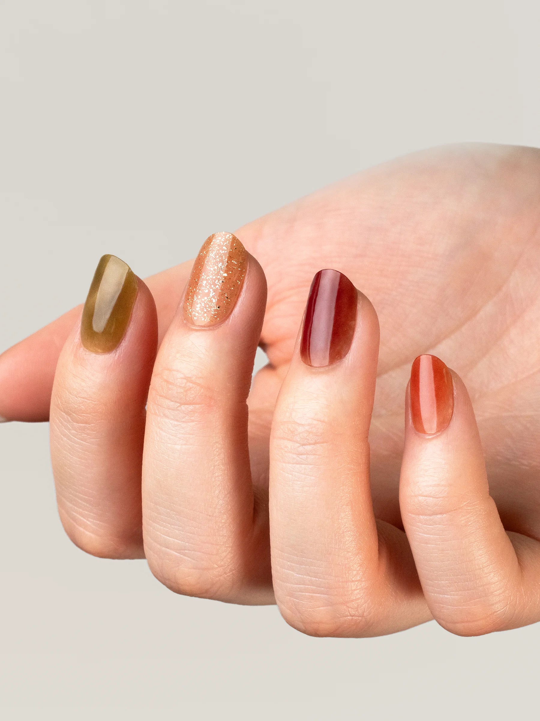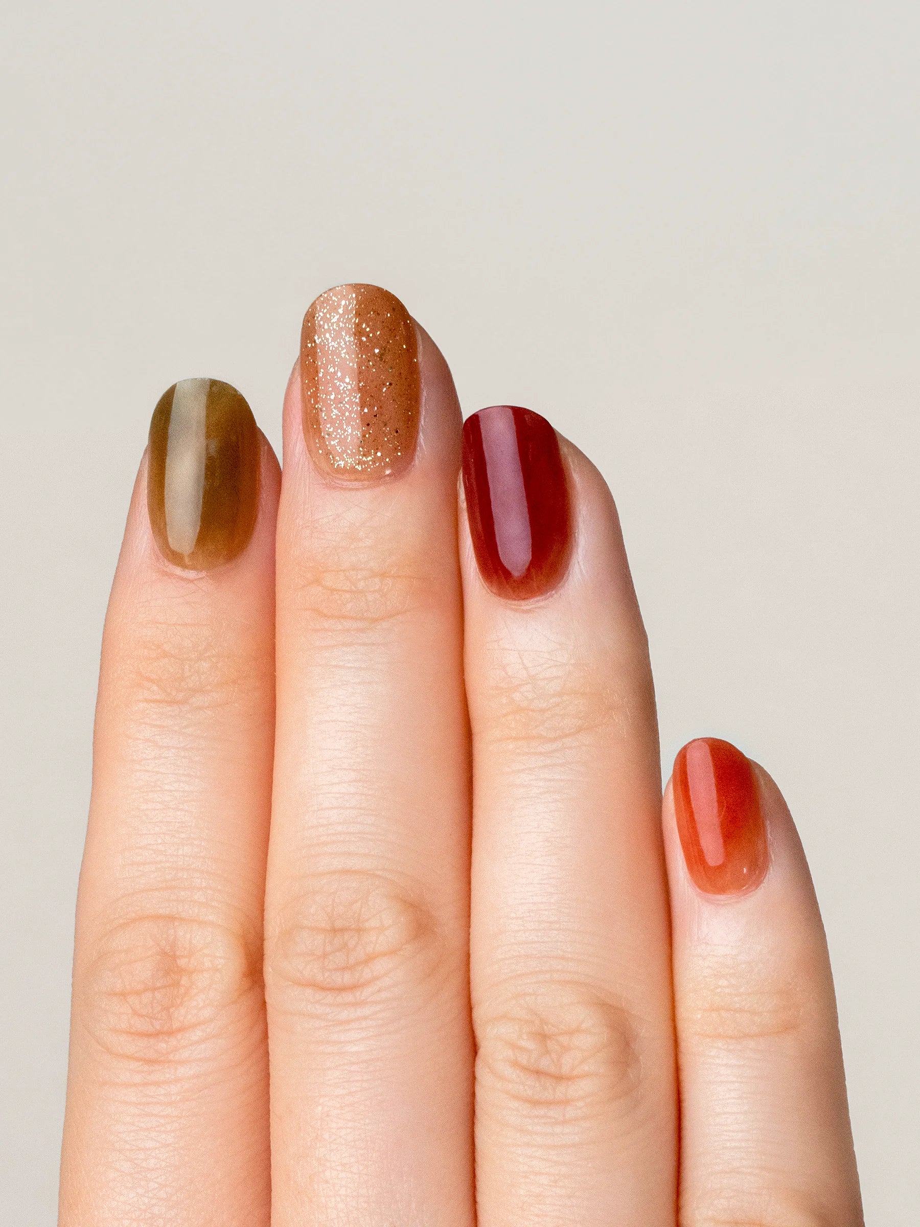 A warm, cozy blend of golden glitter, olive green, burnt orange, and deep red — this set captures the essence of falling leaves and pumpkin spice vibes.