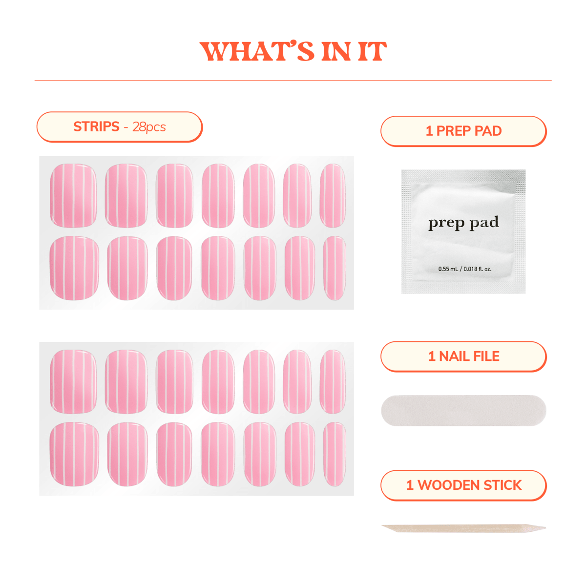 What's in it: 28 strips, 1 Prep pad, 1 Nail file, 1 Wooden stick. No LED required