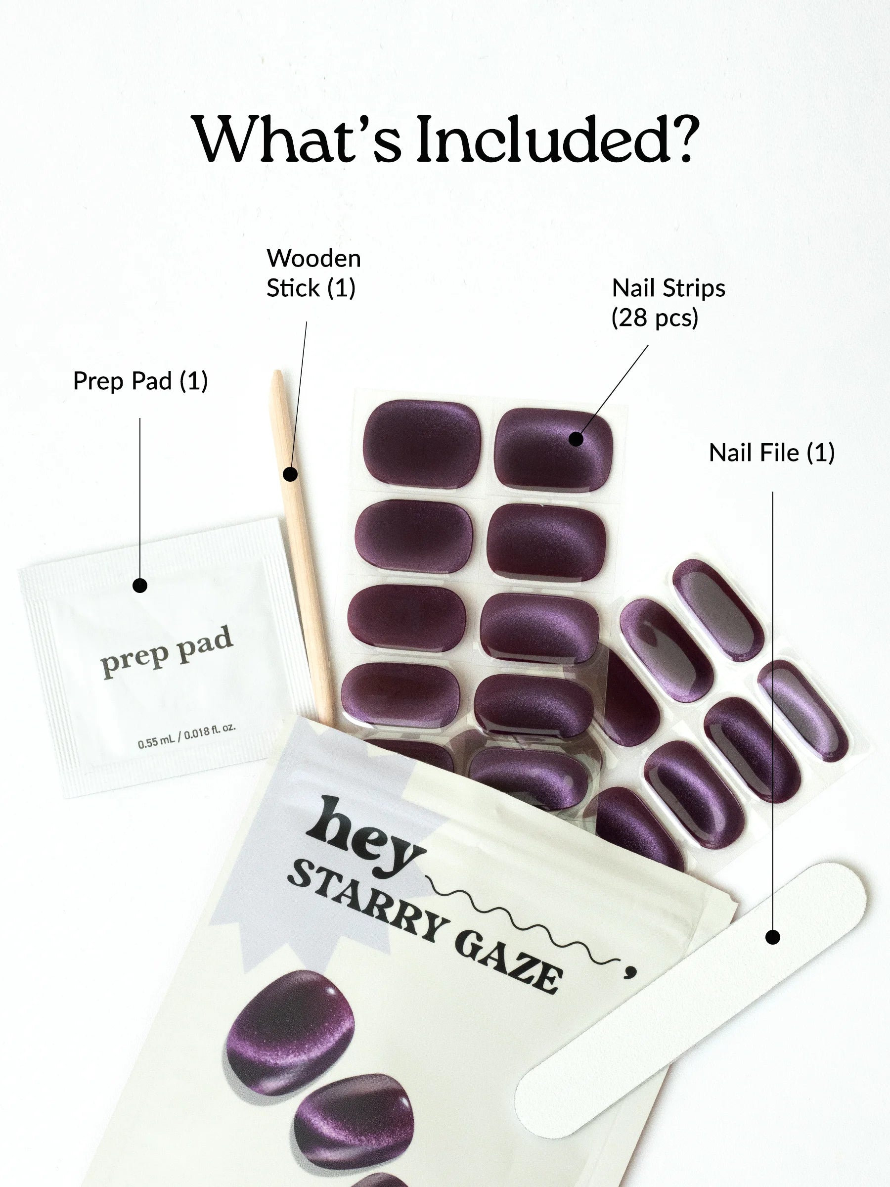 What's in it: 28 strips, 1 Prep pad, 1 Nail file, 1 Wooden stick. No LED required