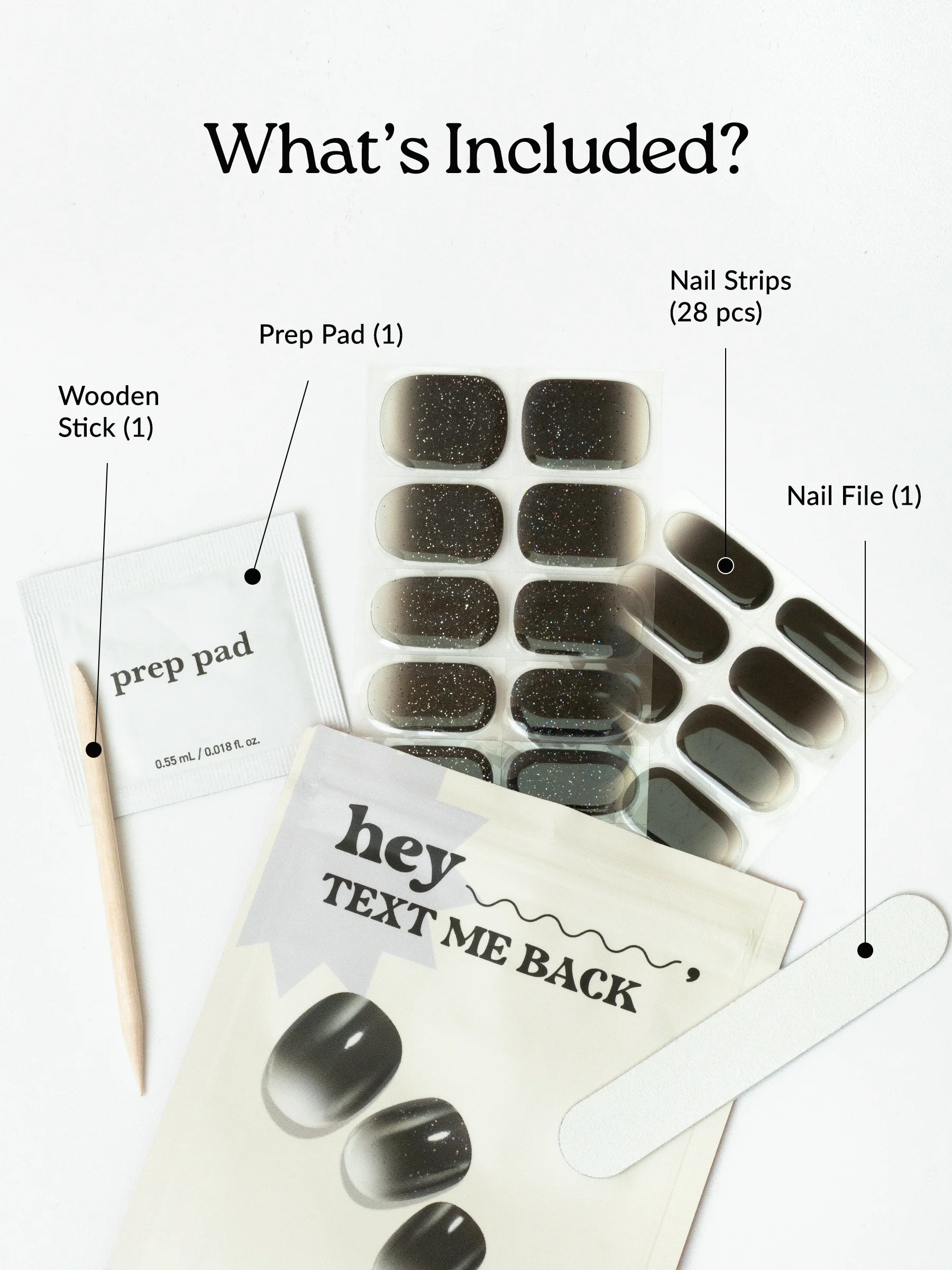 Begin with clean, dry nails and push back your cuticles. Lightly buff your nails to create a smooth surface if needed. Then, use the included prep pad to eliminate any oils or residue.