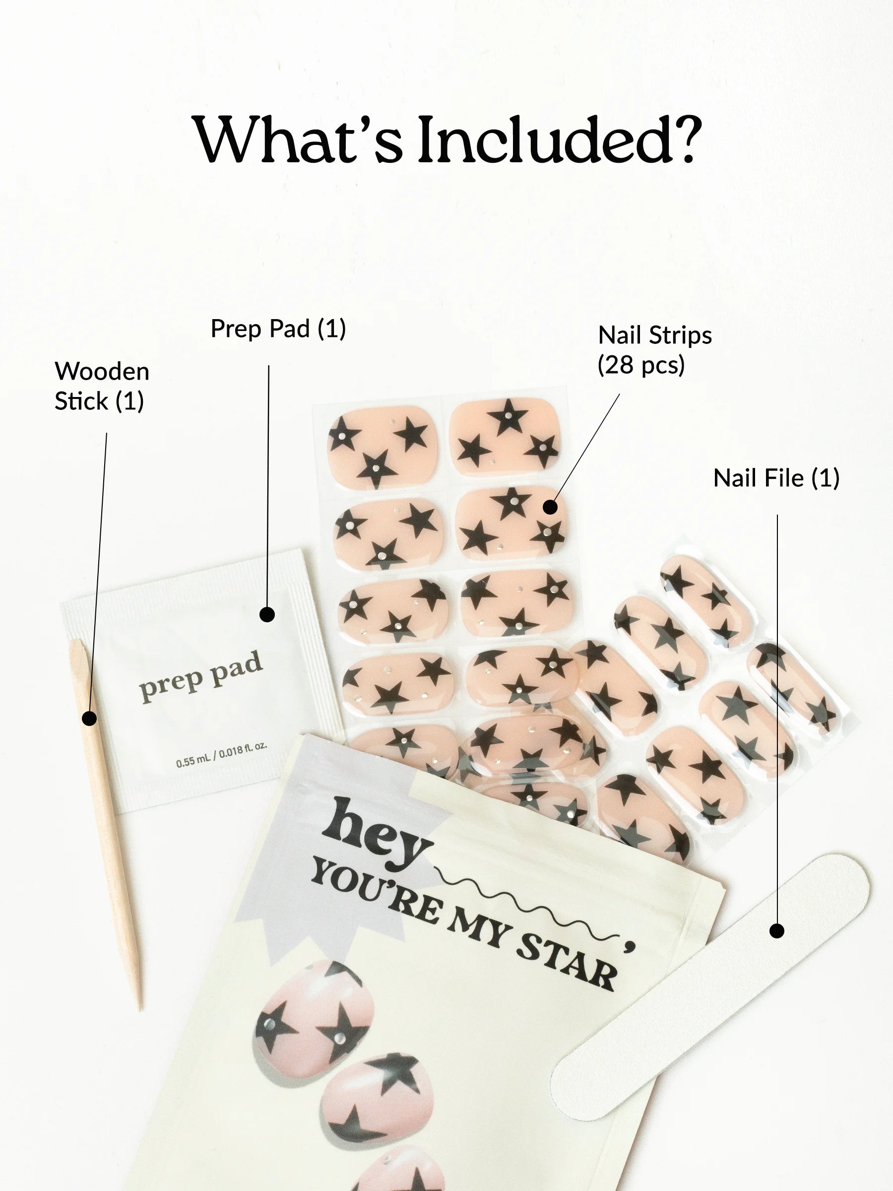 Begin with clean, dry nails and push back your cuticles. Lightly buff your nails to create a smooth surface if needed. Then, use the included prep pad to eliminate any oils or residue.