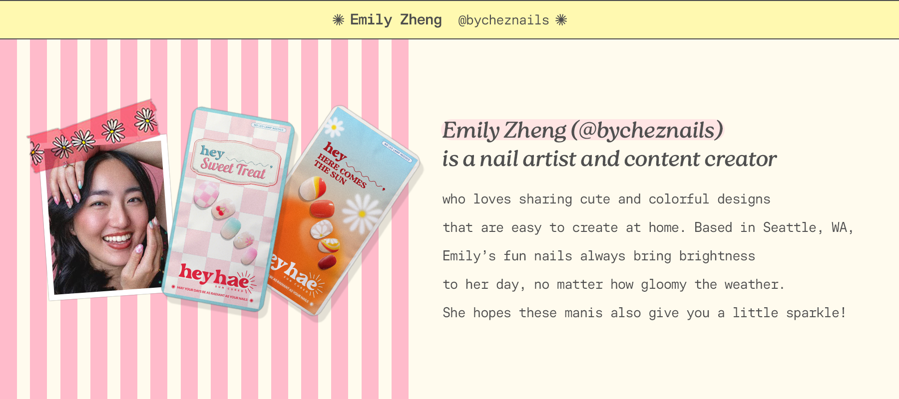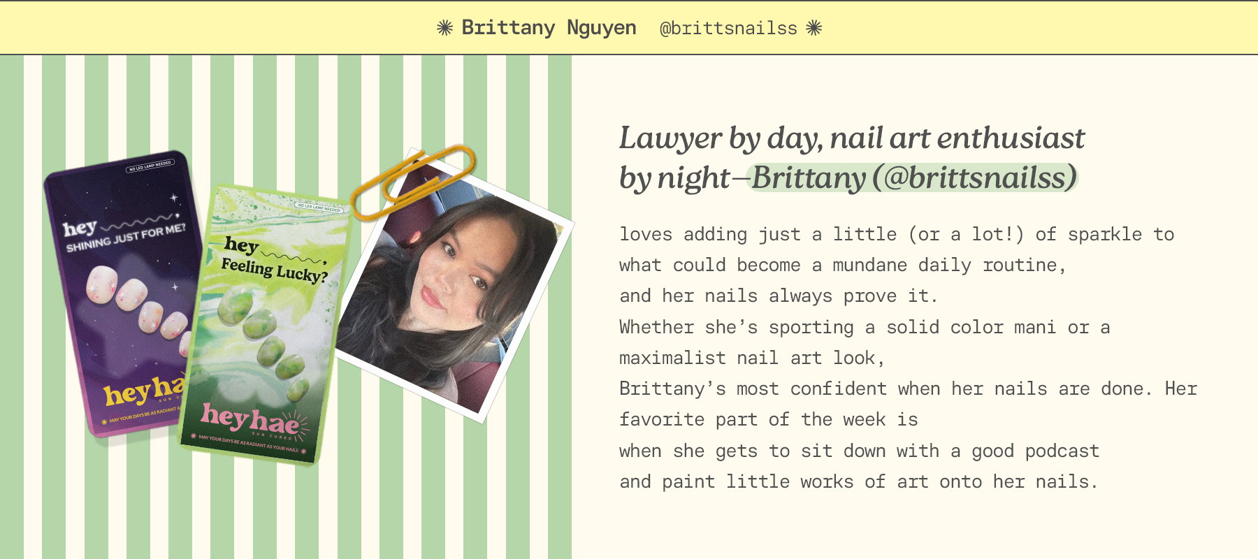 Nails are tiny canvases that broadcast who you are—your mood, your moment, your vibe. That’s why we’re obsessed. Brittany and Emily share that same passion, turning every mani into a piece of their life story. Dive into their journeys, feel the spark, and maybe—just maybe—you’ll be the next creative mind we team up with on our upcoming collection.