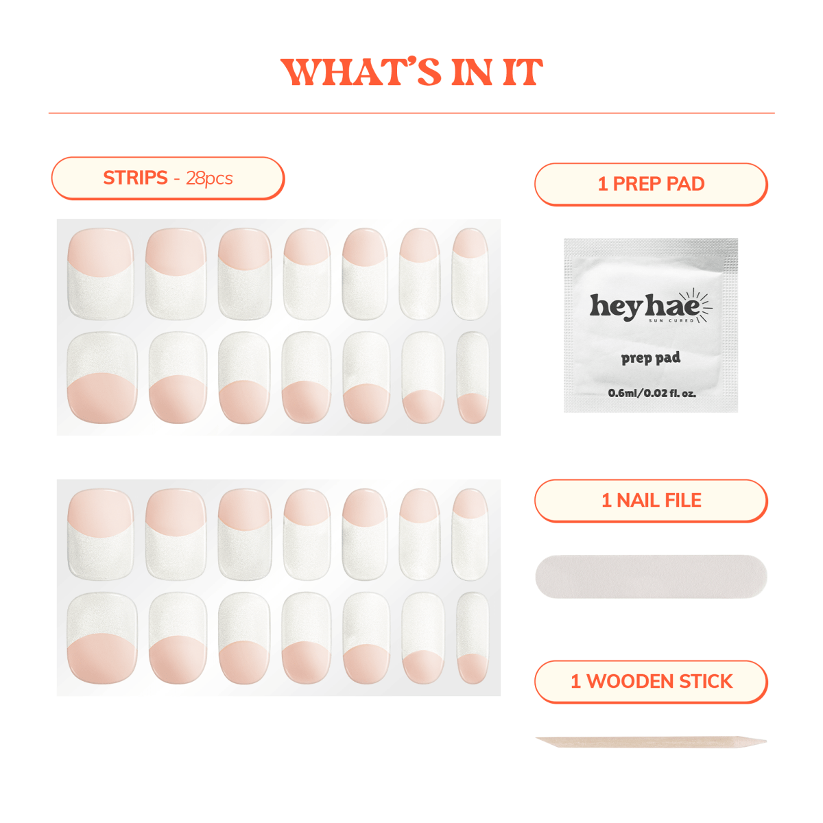 What's in it: 28 strips, 1 Prep pad, 1 Nail file, & 1 Wooden stick. No LED required