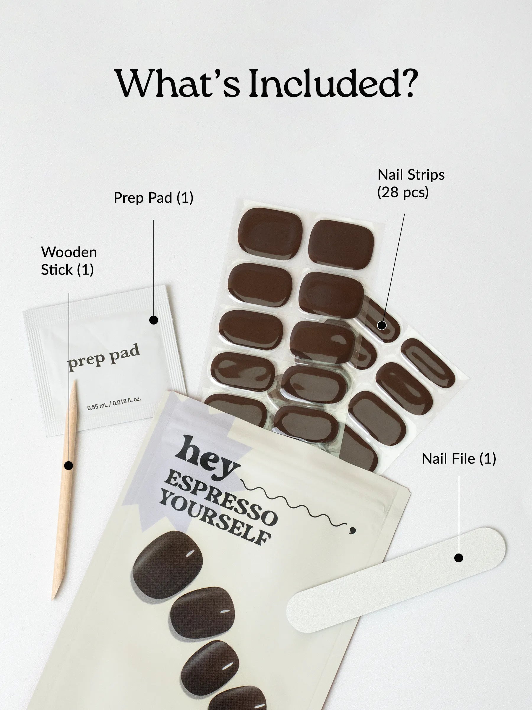 What's in it: 28 strips, 1 Prep pad, 1 Nail file, 1 Wooden stick. No LED required